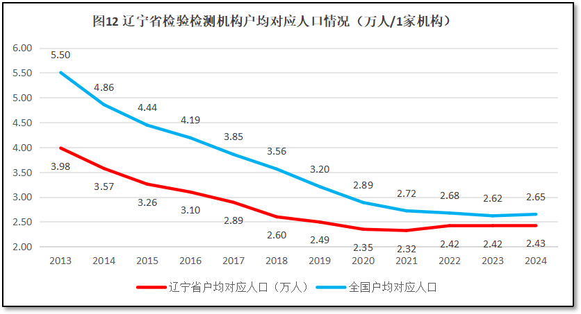 再来看辽宁地区检验检测机构户均对应服务的人口情况。2024年末,辽宁省常住人口4155万人,检验检测机构户均服务人口2.43万人,比全国平均数2.65万人低2200人,排名全国第17位,较2023年度排名提升了1位。可见,相对于辽宁省人口数量来说(最近十年辽宁省常住人口呈现下降趋势),当地的检验检测机构数量也显得多了一些,不过2024年的情况略微有所好转。过去12年,辽宁省检验检测机构户均对应的人口数量与全国的情况进行比较,如图12所示。